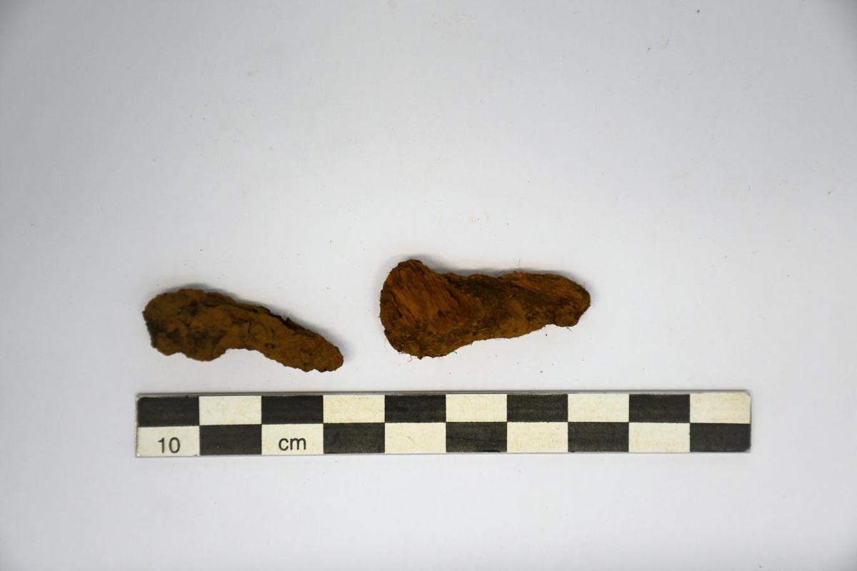 Tveir járnnaglar. Viðarleifar fastar við annan þeirra.