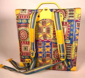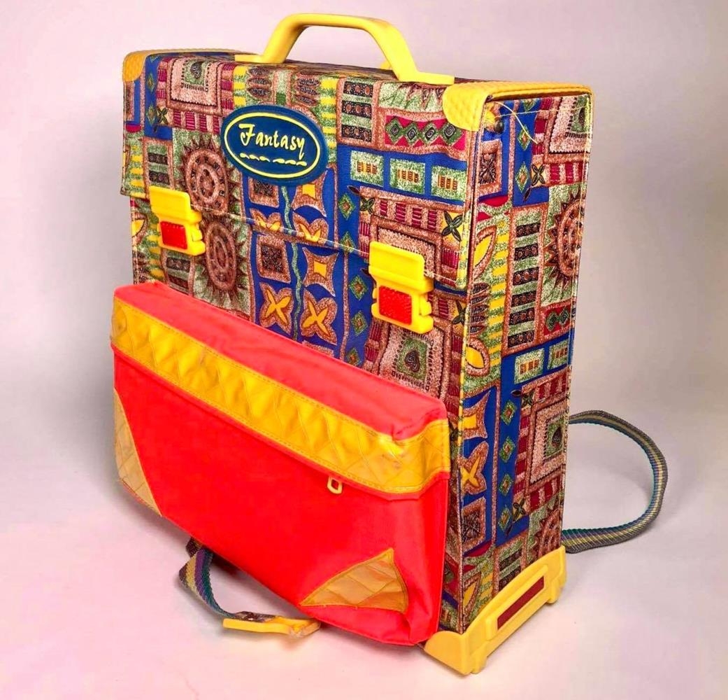 Litrík skólataska, kassataska frá um 1990. Merki: Fantasy. Laufey hefur líklega fengið hana frá eldra systkini. Hörð taska úr plasti, einn geimur, endurskinsmerki á smellum og hólfi framan á. Hólfið er skær appelsínugult en taskan er mjög litrík með allskonar munstri. Gulir plastkantar og gult hald.