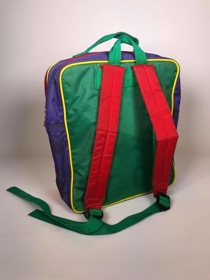 Leikskólataska frá því þegar Kristinn var á leikskólanum Iðavellir á Akureyri. Var notuð af báðum börnum Hönnu. Litrík með mörg rennd hólf. Teiknimyndafígúrur haldandi á litum og strokleðrum, strokleðursbíll. Taskan er bleik, græn og fjólublá með 3 renndum hólfum að framan og 2 stórum aðal hólfum í töskunni sjálfri.