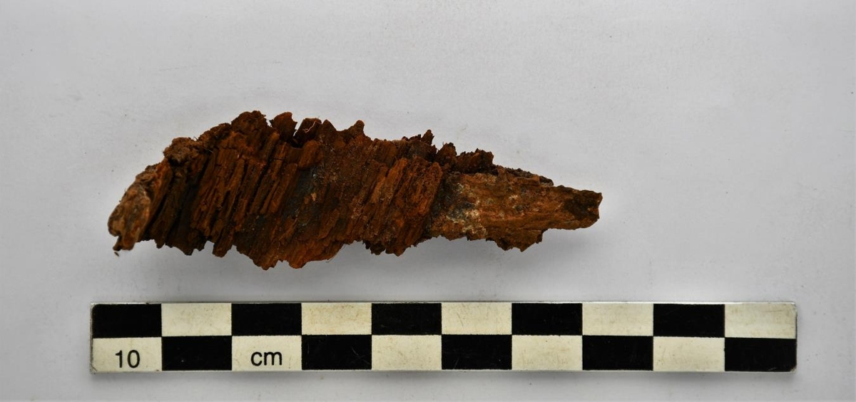 Viðarleifar fastar við járnnaglann. Annar endinn er boginn í 90°.