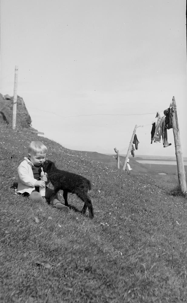 Ungur drengur, líklega Runólfur Valdimarsson, gefur heimalning af pela.