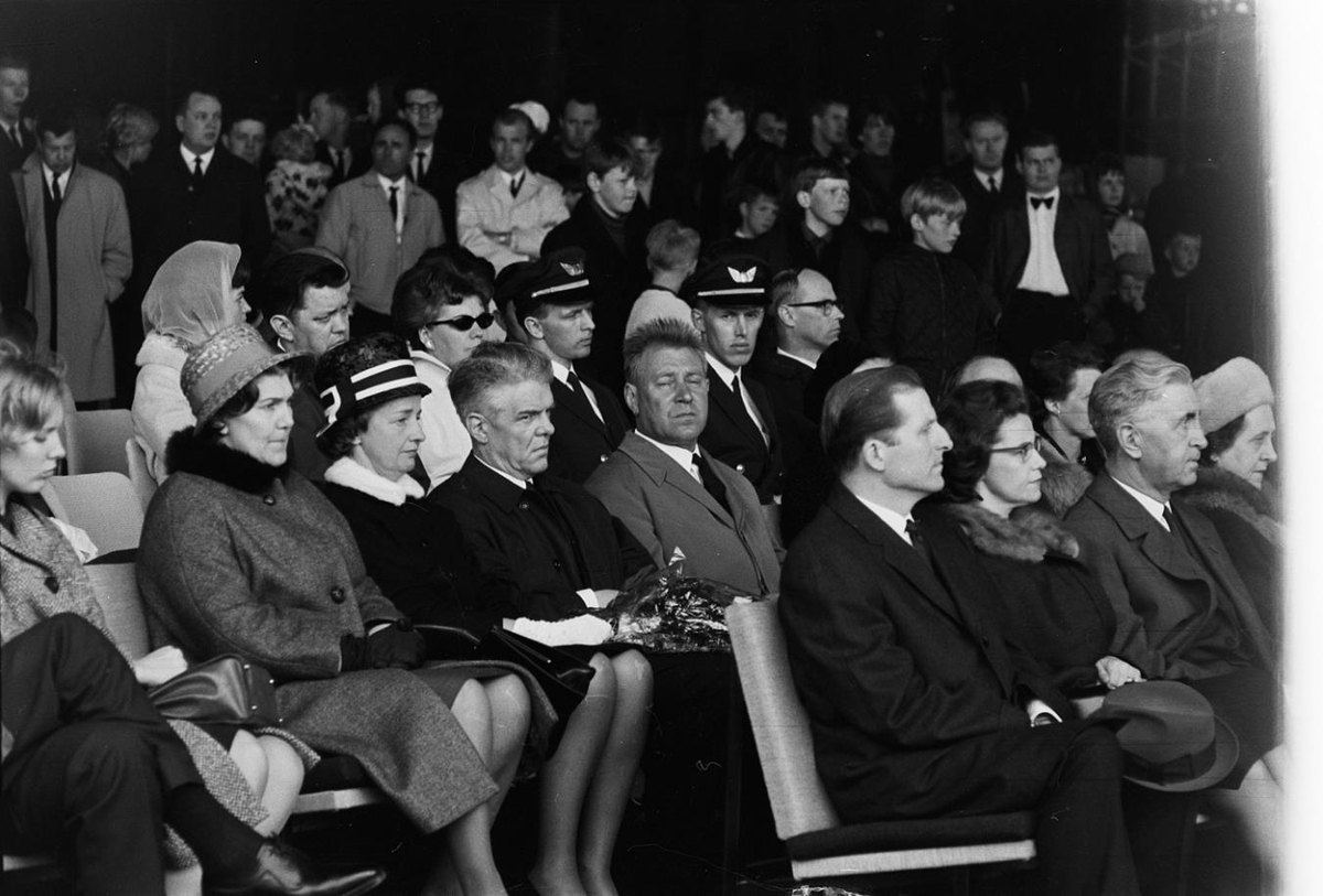 Tekið í flugskýli á flugvelli. Fólk situr í stólum og fylgist með ræðuflutningi. Aftar stendur fólk.