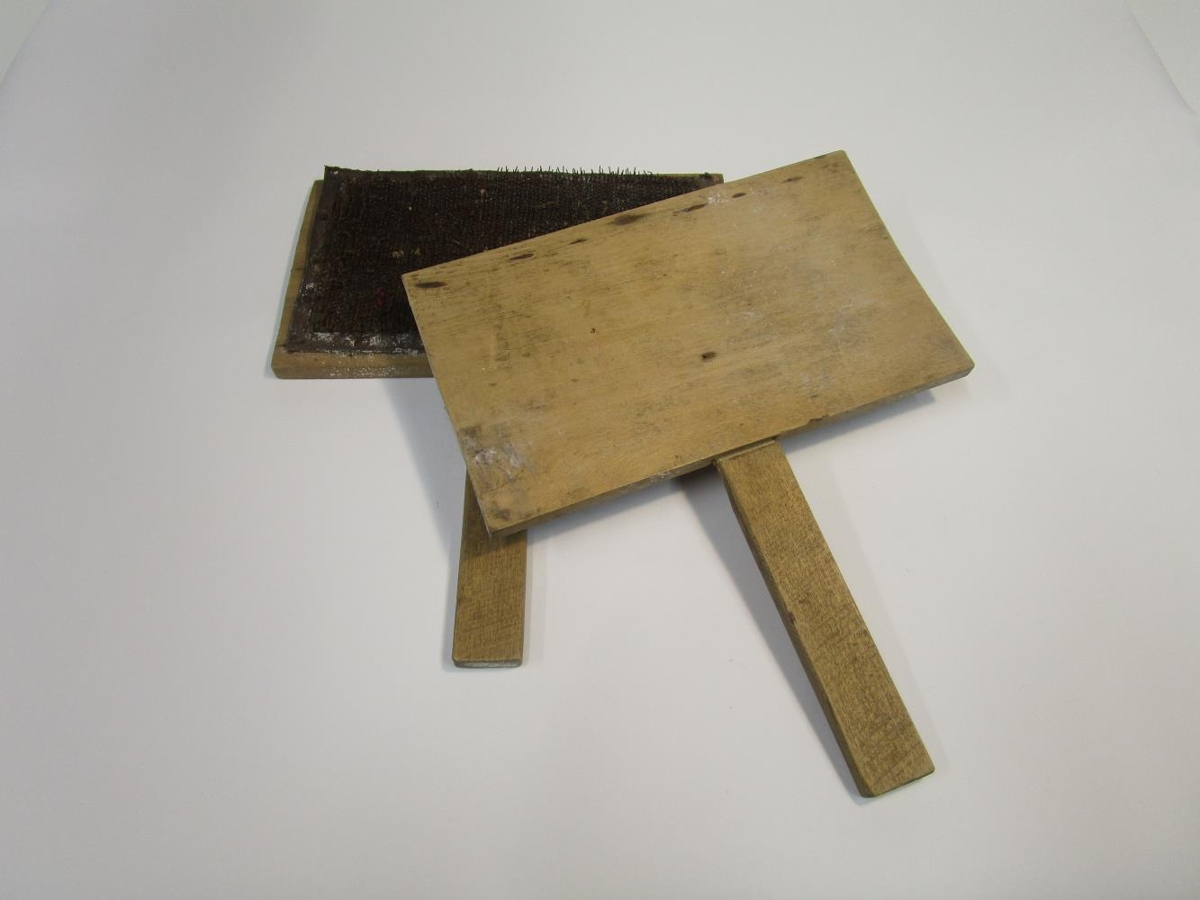 Ullarkambar úr búi Kristínar Níelsdóttur og Höskuldar Pálssonar sem bjuggu í Sellátri (Saurlátri) á Breiðafirði 1943 - 1945 og síðan í Stykkirhólmi. Á spjöldin er neglt skinn sem tindarnir eru festir í. Þeir eru mikið farnir að ryðga.