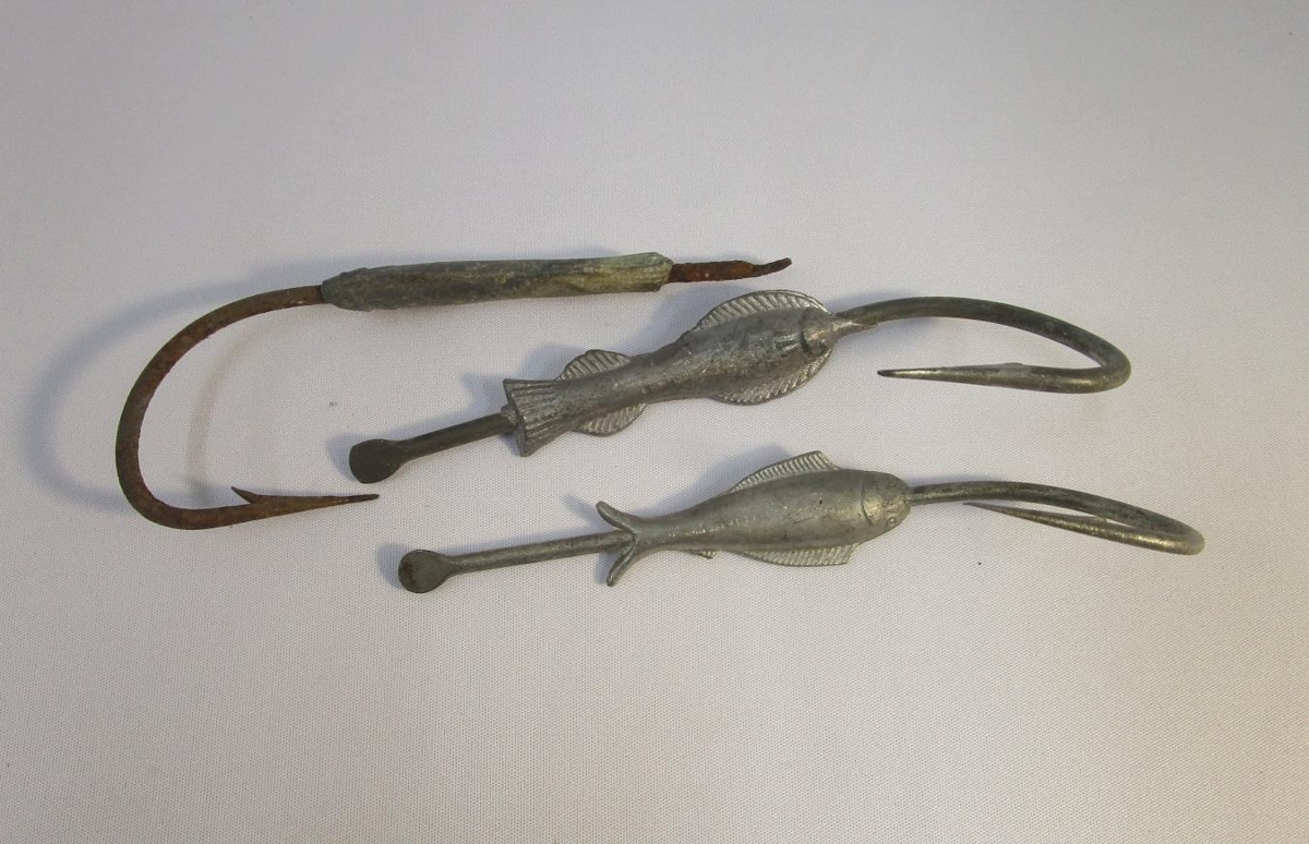 Þrír stórir handfæraönglar, skakönglar, með ásteyptum tinfiski. Fiskarnir eru af tveimur mismunandi gerðum og eru hugsaðir sem agn. Önglarnir eru 13 - 14,5 cm að lengd.
