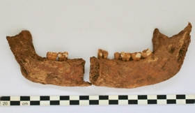 Kjálkabein í tveimur pörtum. 1 tönn tekin í C14.