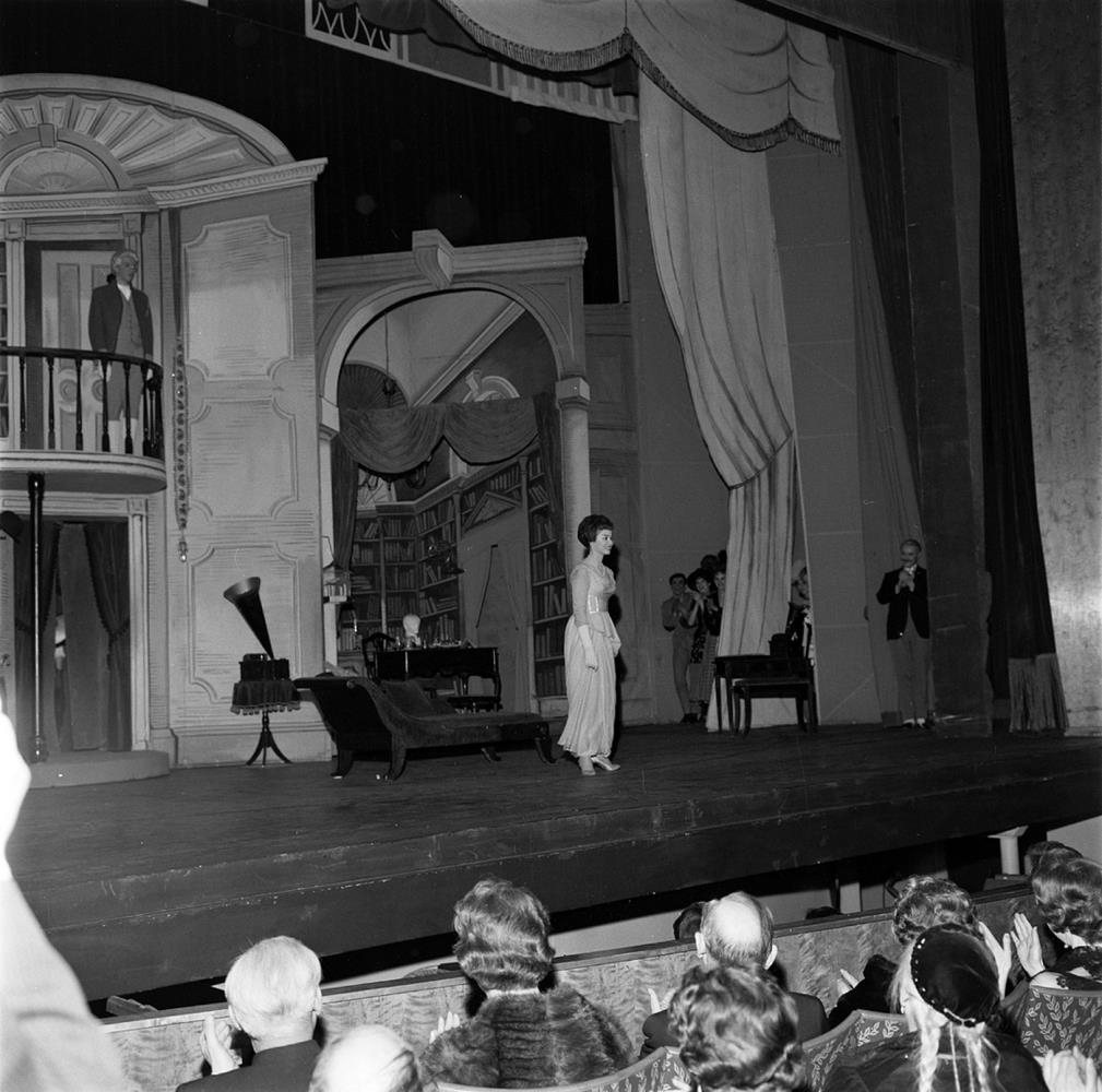 Leiksýning. Kona í kjól stendur á miðju sviðinu. Leikmyndin er stofa og er sessalón, borð og hljómflutningstæki. Uppi á svölum yfir stofunni stendur karlmaður. Einnig eru fleiri leikarar sem standa fjær. Það sést aftan á áhorfendur sem eru fremstu bekkjunum.