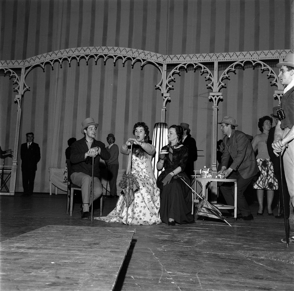 Leiksýning. Leikarar á sviði. Fyrir miðju sviði sitja tvær konur og einn karlmaður, konurnar eru með regnhlífar en maðurinn er með hatt og staf.
