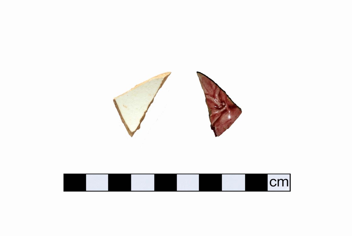 Leirkersbrot úr hvítleir með upphleyptu skrauti með rauðum glerungi á ytra borði og hvítum á innra. 2,7x1,6 sm.