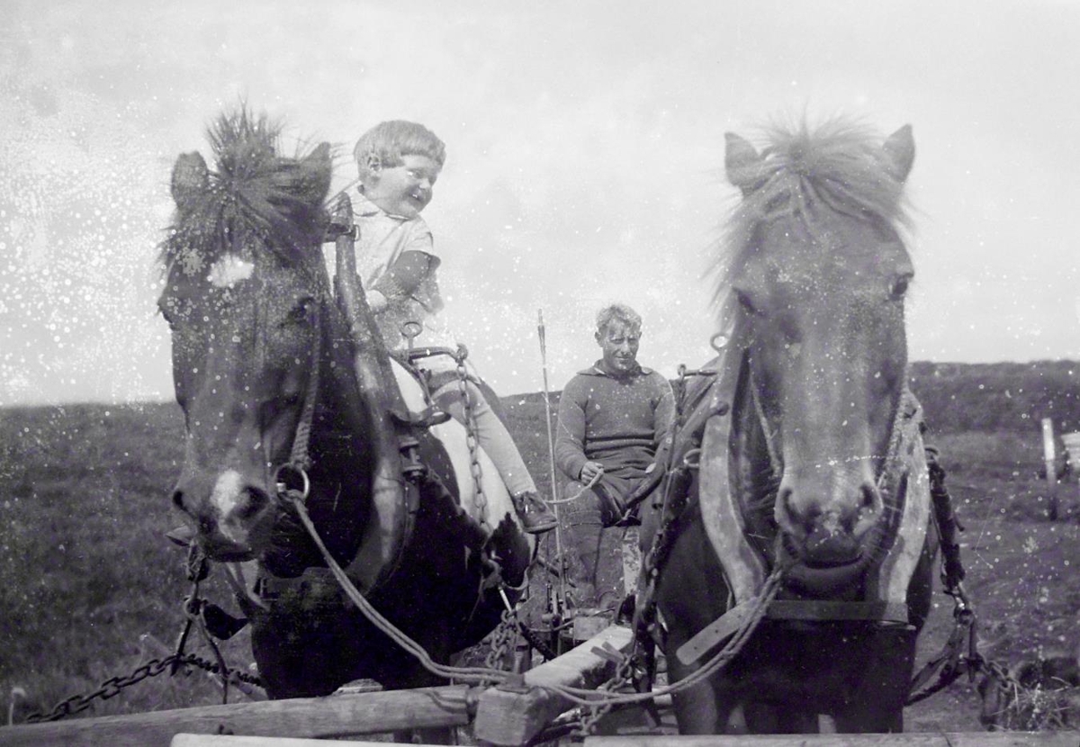 Þórarinn Helgason í Þykkvabæ í Landbroti við plægingar. Dóttir hans Inga á hestbaki.