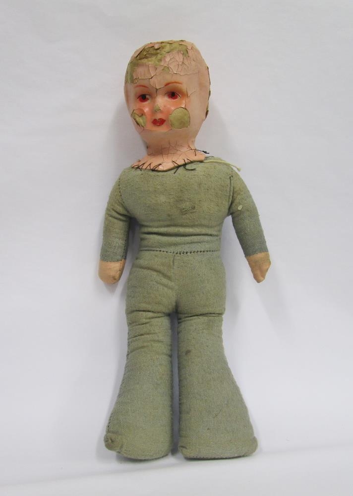 Dúkka, brúða. Búkurinn er heimasaumaður og höfuðið keypt í búð. Höfuðið er úr einskonar pappamassa með þunnu yfirlagi sem mjög er farið að molna. Dúkkan er úr bláu efni sem að framan er orðið mjög upplitað. Sumarið 2001 afhentu fimm systkini frá Snorrastöðum í Kolbeinsstaðahreppi 60 - 70 ára gömul leikföng sem varðveist höfðu á Snorrastaðaheimilinu.