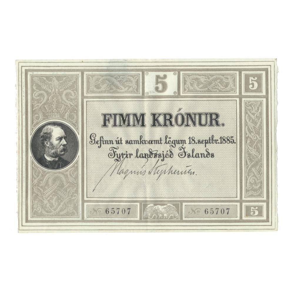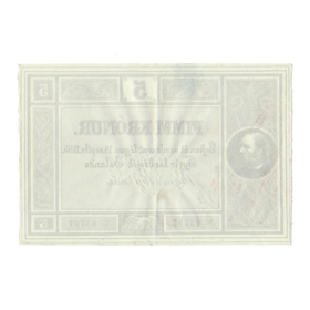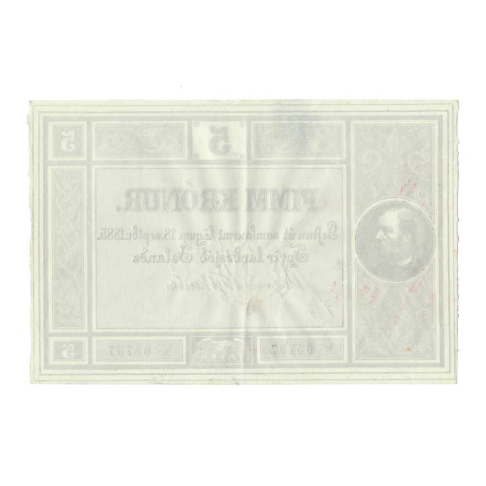 5 Krónu óútgefinn seðill úr fyrstu seðlaröð landsjóðs gefinn út samkvæmt lögum nr. 14/18. sept,. 1885 um stofnun landsbanka.