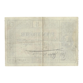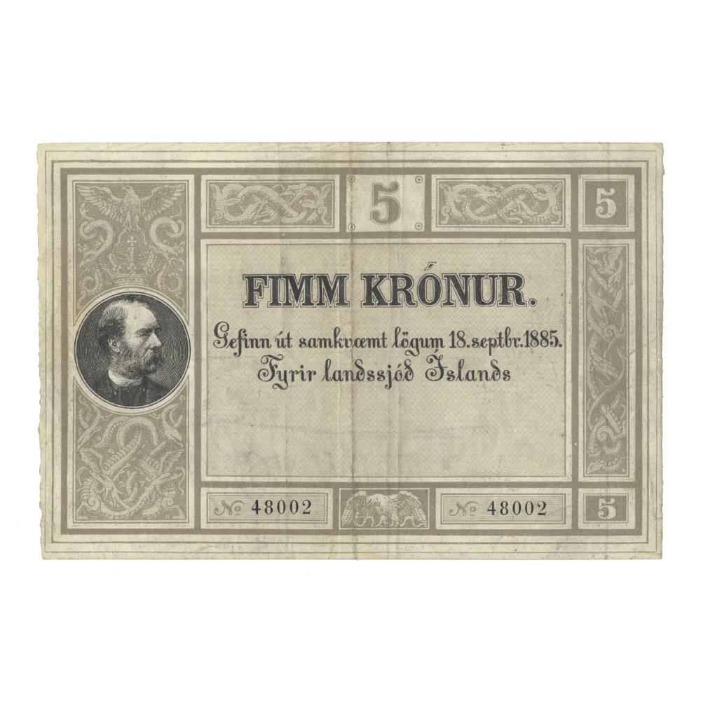 5 Krónu óútgefinn seðill úr fyrstu seðlaröð landsjóðs gefinn út samkvæmt lögum nr. 14/18. sept,. 1885 um stofnun landsbanka.