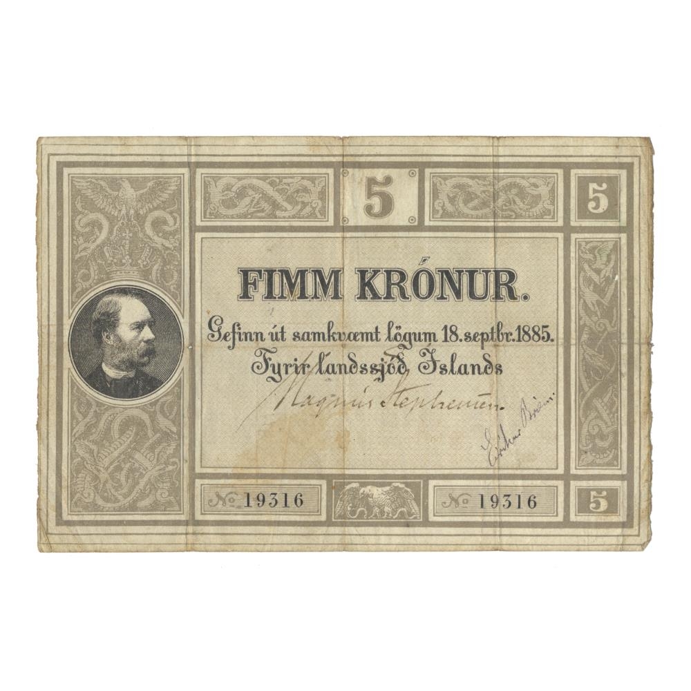 5 krónu seðill úr fyrstu seðlaröð landsjóðs gefinn út samkvæmt lögum nr. 14/18. sept,. 1885 um stofnun landsbanka.