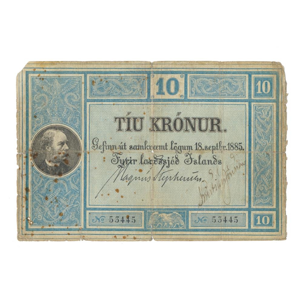 10 Krónur seðill úr fyrstu seðlaröð landsjóðs gefinn út samkvæmt lögum nr. 14/18. sept,. 1885 um stofnun landsbanka.