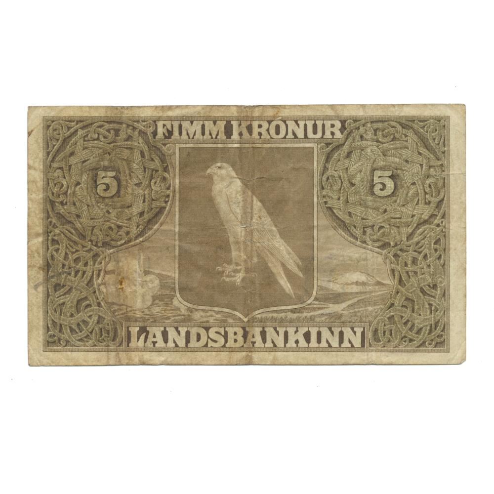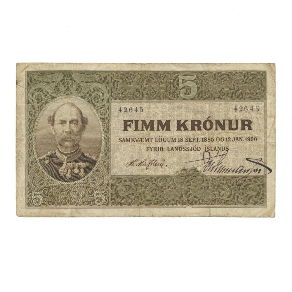 5 Krónu seðill úr annari seðlaröð landsjóðs gefinn út samkvæmt lögum nr. 14 / 18. sept. 1885 um stofnun landsbanka og lögum nr. 2 / 12. jan. 1900 um breyting á lögum um stofnun landsbanka 18. sept.1885 [landsstjórninni heimilað að gefa út seðla fyrir allt að fjórðungi milljónar í viðbót við það sem áður var ákveðið].