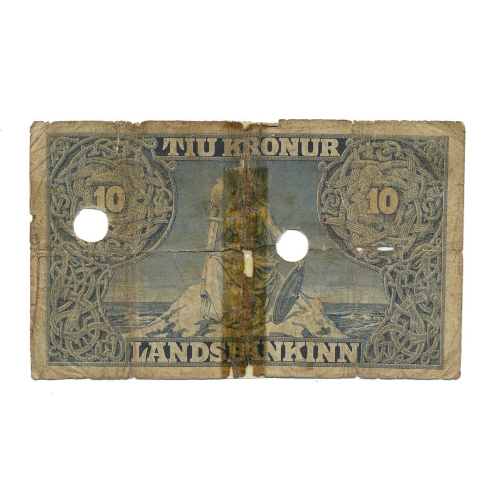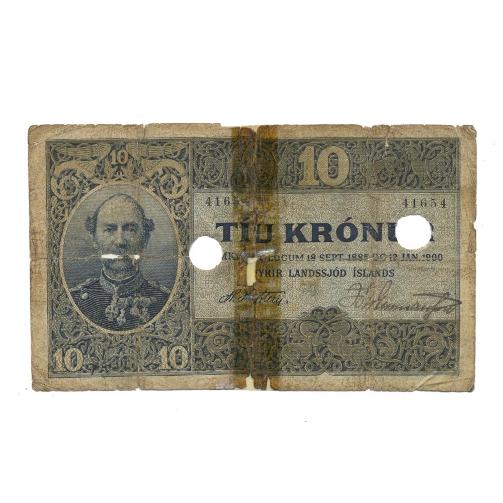 10 Krónu ógildur ( gataður ) seðill úr annari seðlaröð landsjóðs gefinn út samkvæmt lögum nr. 14 / 18. sept. 1885 um stofnun landsbanka og lögum nr. 2 / 12. jan. 1900 um breyting á lögum um stofnun landsbanka 18. sept.1885 [landsstjórninni heimilað að gefa út seðla fyrir allt að fjórðungi milljónar í viðbót við það sem áður var ákveðið].