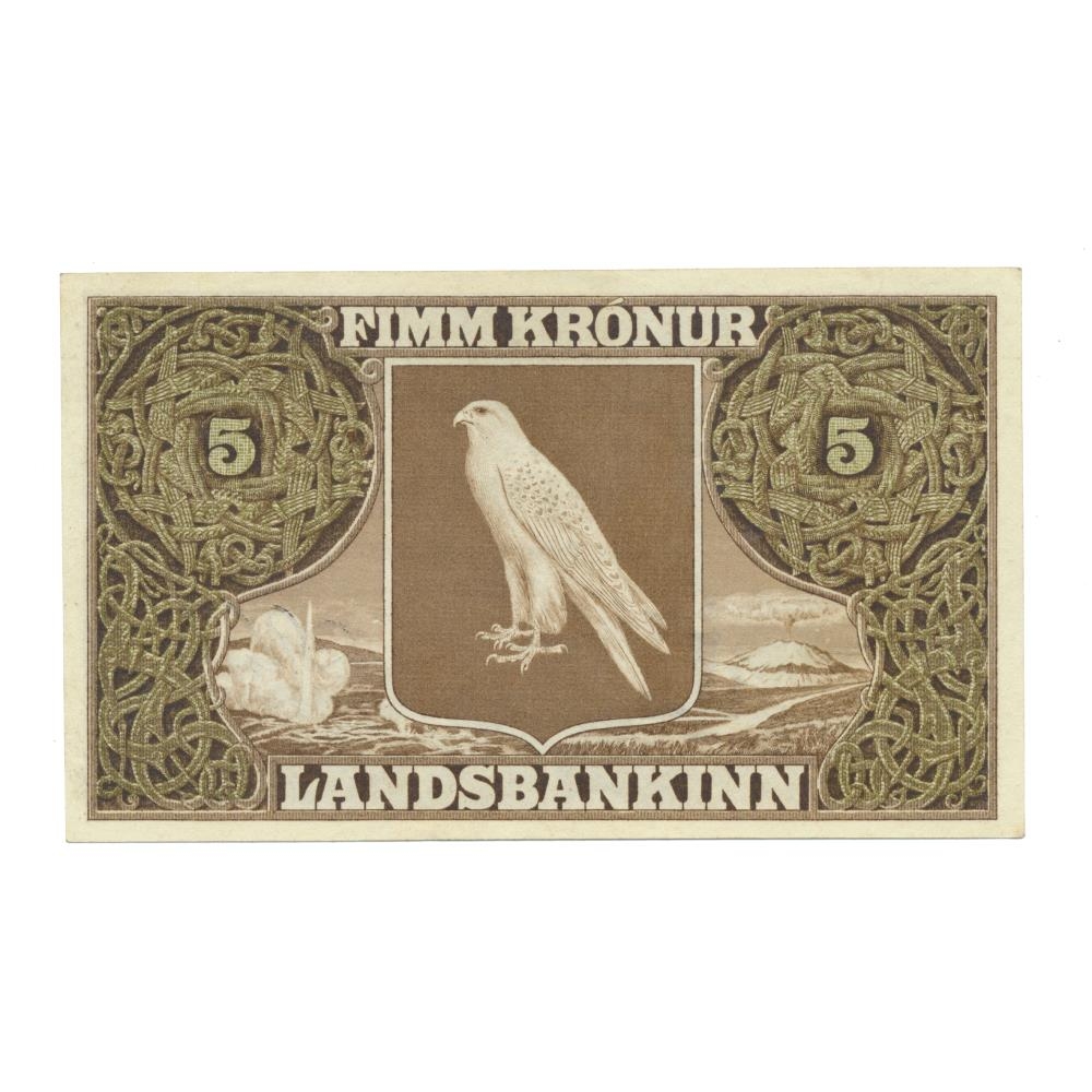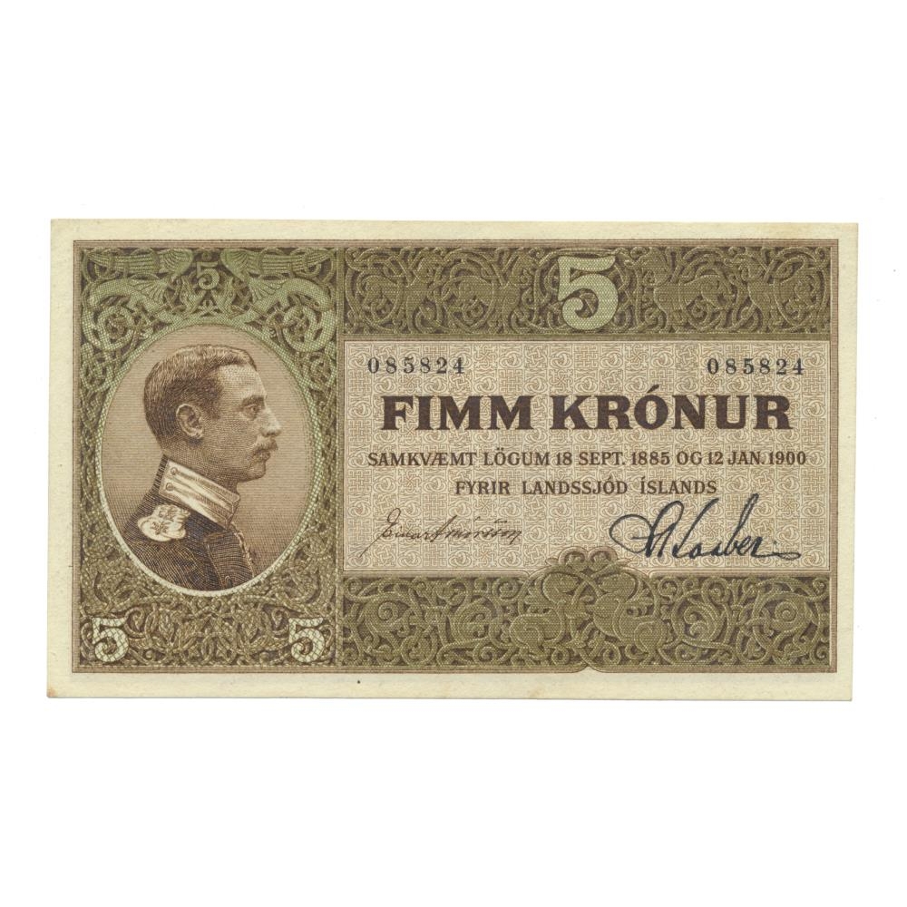 5 krónu seðill úr þriðju seðlaröð landsjóðs gefinn út samkvæmt lögum nr. 14 / 18. sept. 1885 um stofnun landsbanka og lögum nr. 2 / 12. jan. 1900 um breyting á lögum um stofnun landsbanka 18. sept.1885 [landsstjórninni heimilað að gefa út seðla fyrir allt að fjórðungi milljónar í viðbót við það sem áður var ákveðið].