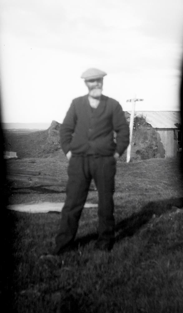 Karlmaður með sixpensara framan við bárujárnsklætt hús.