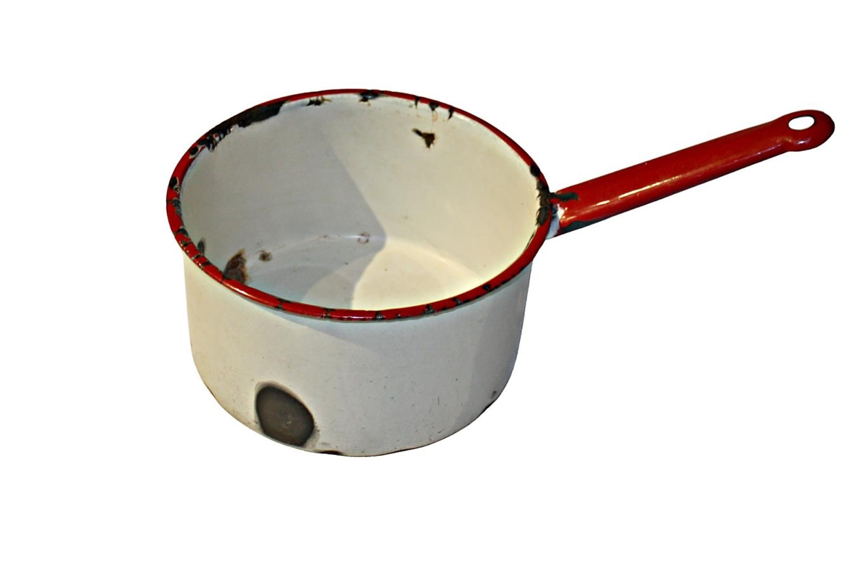 Lítill skaftpottur hvítur og rauður emanleraðu. Töluvert skellóttur