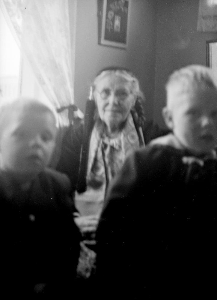 Halla Einarsdóttir í Þykkvabæ efri í Landbroti ásamt tveimur ungum drengjum sem eru fv. Þórarinn og Einar Bjarnasynir, Þykkvabæ 1.