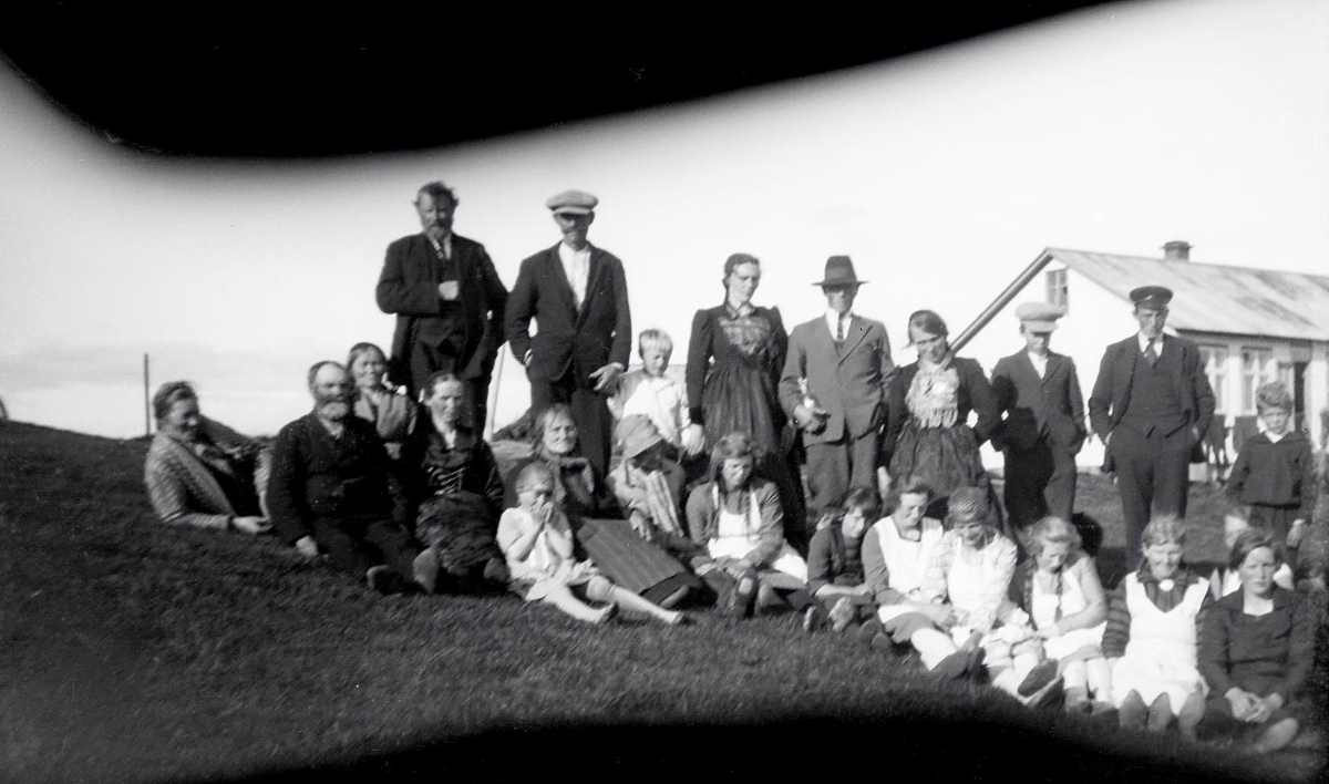 Hópmynd af prúðbúnu fólki Á Arnardrangi í Landbroti. Íbúðarhús í baksýn. Standandi lengst til vinstri er líklega Runólfur Bjarnason í Hólmi í Landbroti.