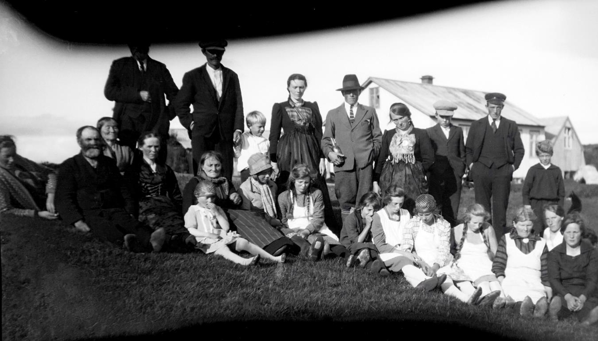 Hópur af prúðbúnu fólki á túninu á Arnardrangi í Landbroti. Standandi lengst til vinstri er Runólfur Bjarnason, Hólmi og sitjandi annar frá vinstri er Sveinn Sveinsson, Fossi í Mýrdal.