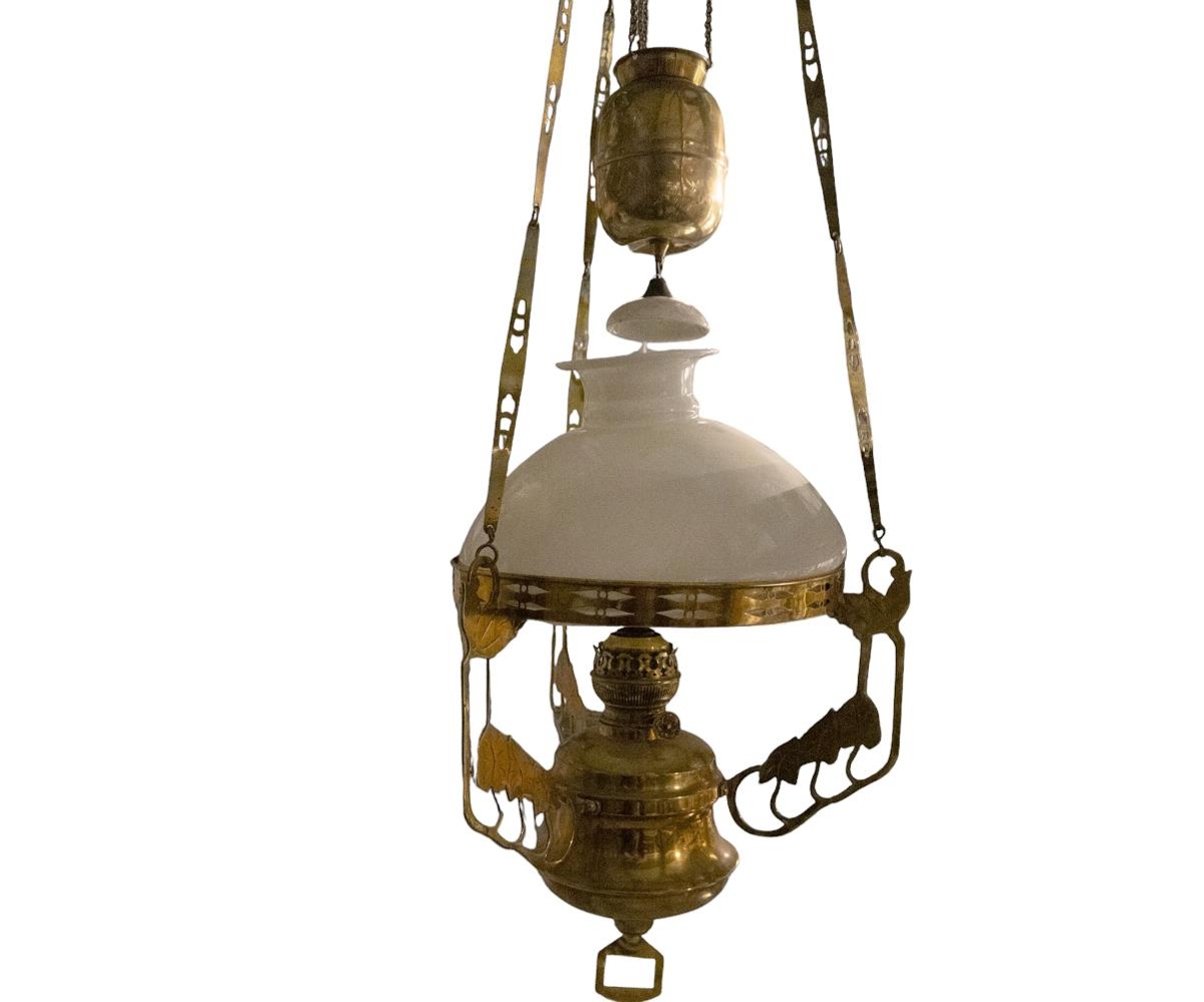 Tvö loftljós/olíulukt, falleg með hvítum glerhjúp en hitt með messing. Kemur úr dánarbúi Hendiks Steinssonar