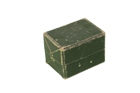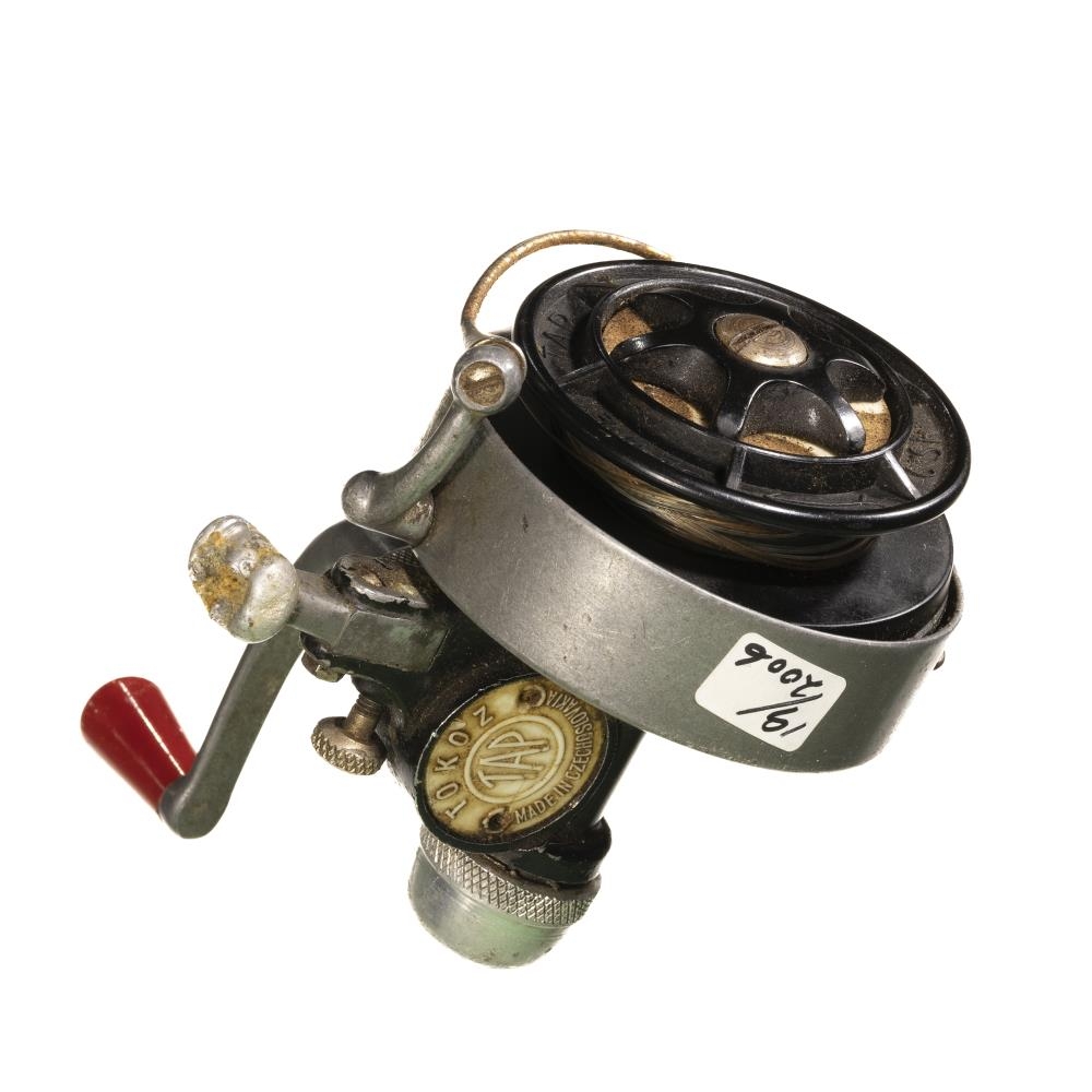 Veiðihjól í grænum pappakassa TOKOZ TAP frá Tékkóslóvakíu. Kemur úr eigu Hreggviðs Hendrikssonar (1937-2002)