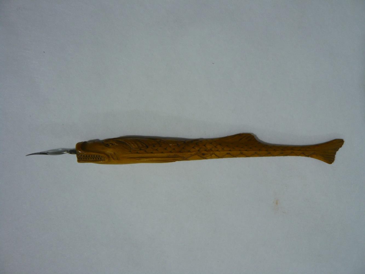 Pennastöng þessi er haganlega útskorin svo hún minnir að vissu marki á hákarl og á líklega að tákna þá skepnu. Pennastöngin er um 15,5 cm löng og þvermálið mest um 1,6 cm.