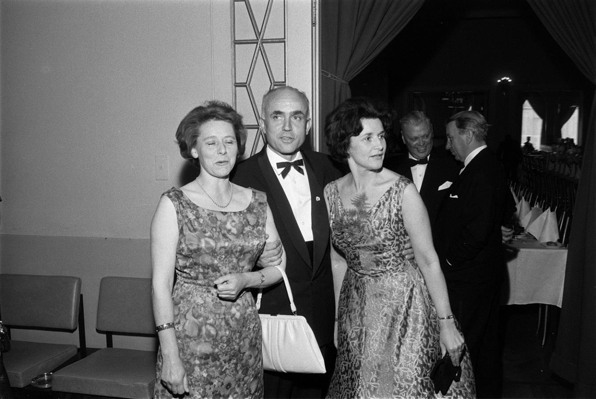 Karlmaður í jakkafötum með tvær konur upp á arminn. Konurnar eru í kjólum og með veski. Þau standa við inngang að sal og má sjá að það er búið að dekka veisluborð. Tveir karlmenn eru í salnum að spjalla saman. Gunnlaugur Þórðarson lögræðingur fyrir miðju.