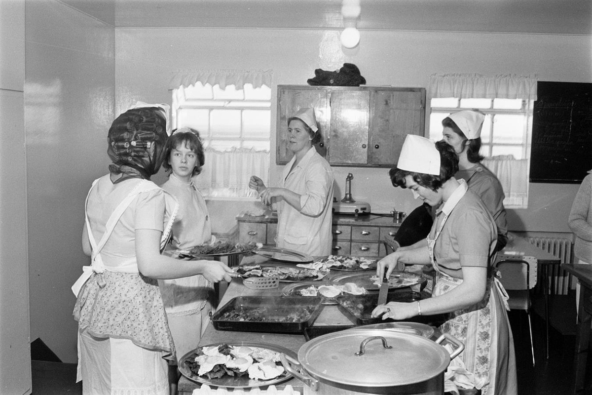 Tekið í eldhúsi í skóla. Stúlkur standa við bekkina og útbúa buff og spæld egg. Kennslukona er einnig í eldhúsinu. Allar eru þær með svuntur og skuplur. Gerður Jóhannsdóttir húsmæðrakennari aftast fyrir miðju.