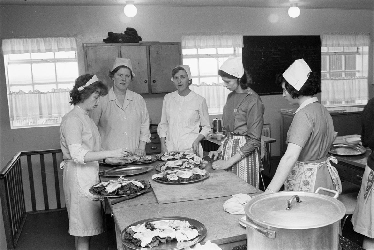 Tekið í eldhúsi í skóla. Stúlkur standa við bekkina og útbúa buff og spæld egg. Kennslukona er einnig í eldhúsinu. Allar eru þær með svuntur og skuplur.