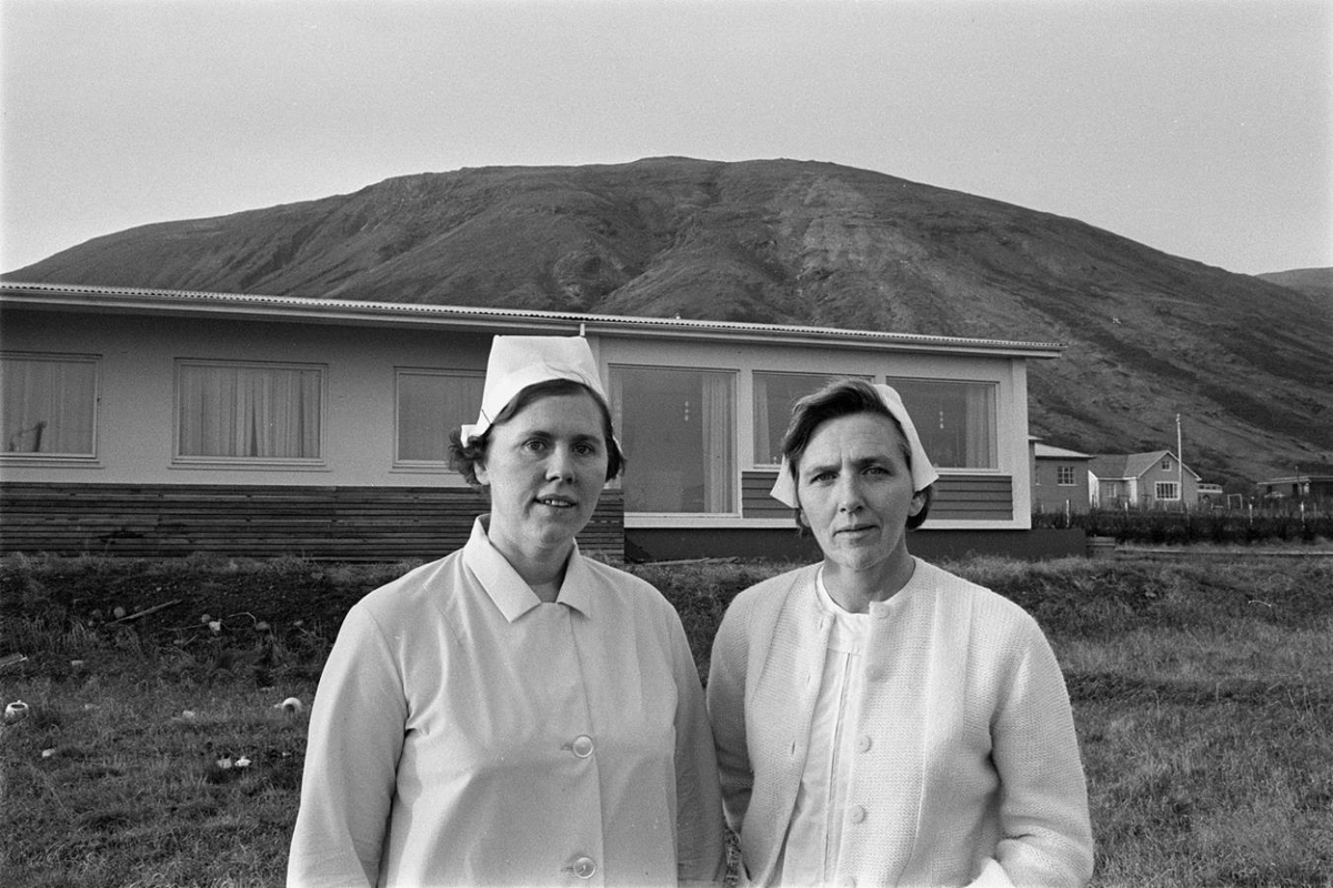 Tekið úti. Tvær konur með kappa á höfði. Fjær eru hús.