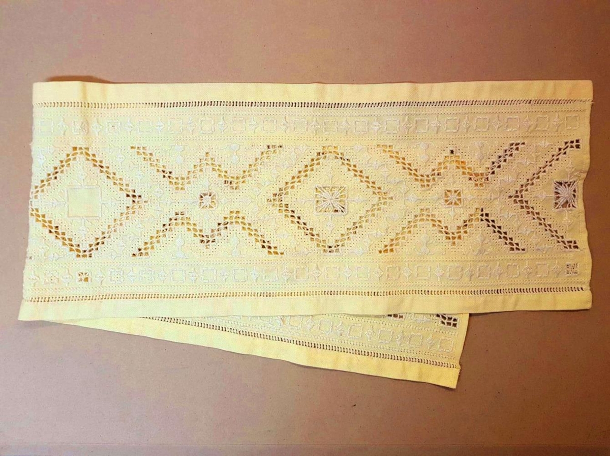 Ljósgulur borðdúkur eða dregill úr fínofnu efni. Dúkurinn er skreyttur með hvítum útsaumi, flatsaumi, krossaumi og harðangri. Frágangur á endum gefa tilefni til að halda að efnið hafi verið skorið úr lengri dúk eða mögulega hafi dúkurinn áður verið kappar.
