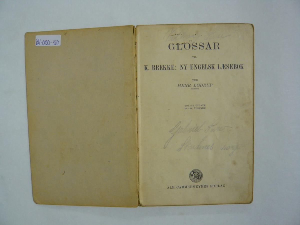 Bókin heitir Glossar til K. Brekke: Ny Engelsk læsebok eftir höfundinn Henr. Lödrup. Á titilsíðu bókarinnar er skrifað með blýanti nafn eigandans Gabriel Syre.