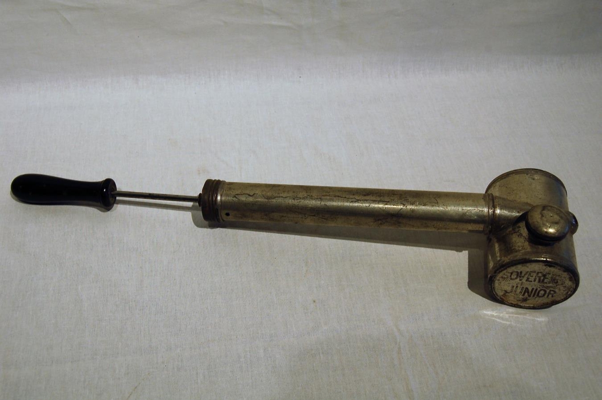 Handdæla úr járni, til þess að úða eiturefnum á grænmetislönd. Dælan er frá miðjum sjötta áratugnum, alheil að sjá.