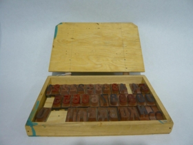 Kassi með 33 stimplum til að festa á handfang. Stimplarnir eru frá Hafnarfirðing og voru notaðir til að stimpla síldar og skreiðartunnur.