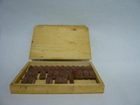 Kassi með 28 stimplum til að festa á handfang. Stimplarnir eru frá Hafnarfirðing og voru notaðir til að stimpla síldar og skreiðartunnur.