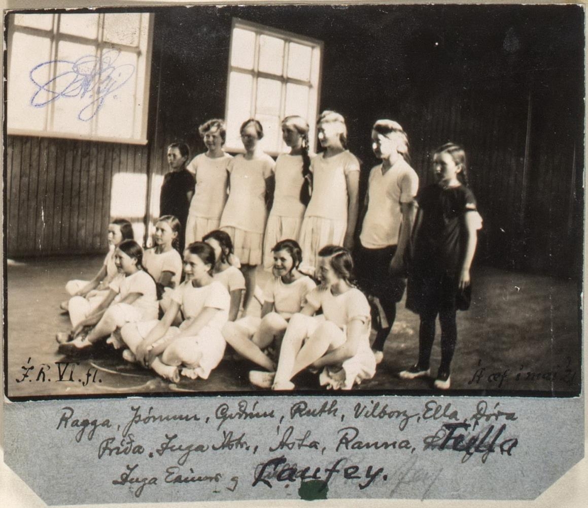Hópmynd af stúlkum í íþróttafötum. Tekið í íþróttasal.