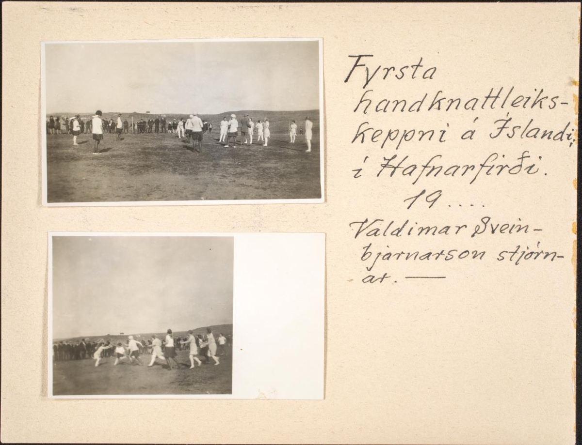 Íþróttamyndir af ýmsu tagi. Fyrsta handknattleikskeppni á Íslandi í Hafnarfirði 19.. Valdimar Sveinbjarnarson stjórnar.