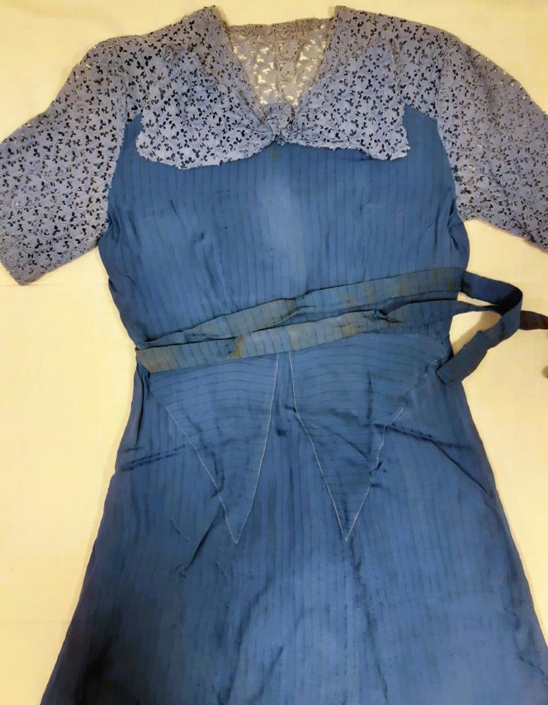 Fermingarkjóll, litaður og saumaður upp. Ljósblár. Efnið ofið með langröndótt en blúnduefni á stuttum ermum og í v-hálsmáli. Stórar siz saz útaukningar niður frá mitti. Stór slaufa úr blúnduefni fylgir og belti.