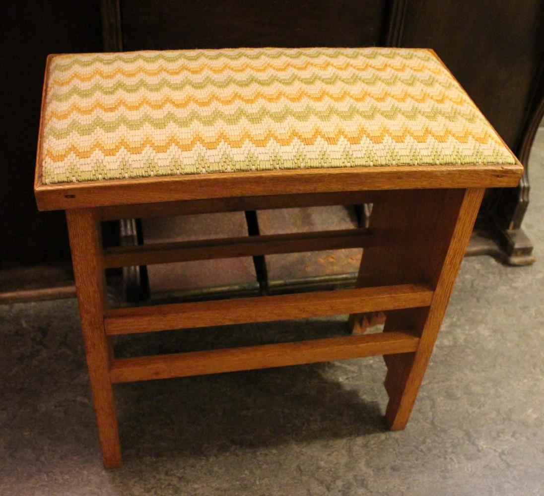 Lítill setbekkur – mögulega notaður fyrir framan hljóðfæri. Seta bólstruð og útsaumuð sennilega í java eða stramma. Litir grænar og ljúsbrúnar sétteringar.