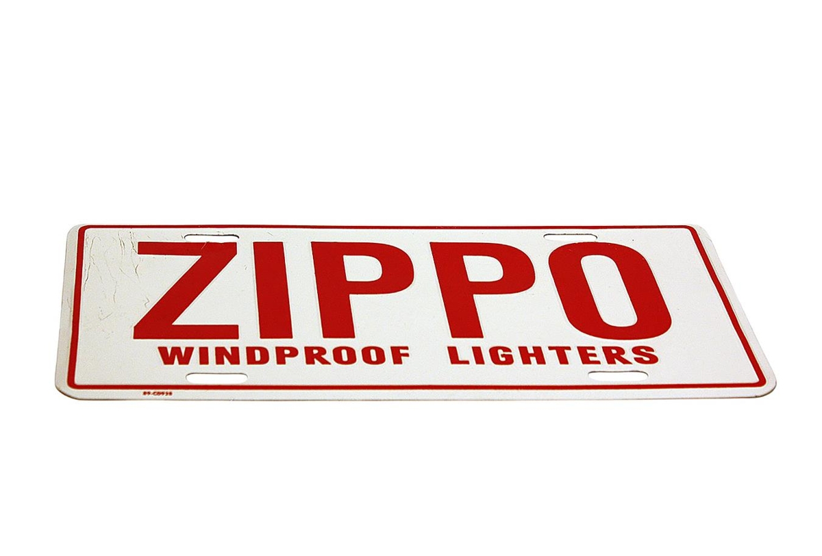 Skilti úr áli (auglýsingaskilti). Texti: ZIPPO windproof lighters. Þegar Axelsbúð (Skipaverslun Axels Sveinbjarnarsonar) var rifinn í september 2005, fékk Byggðasafnið hluti úr lager til að sýna.