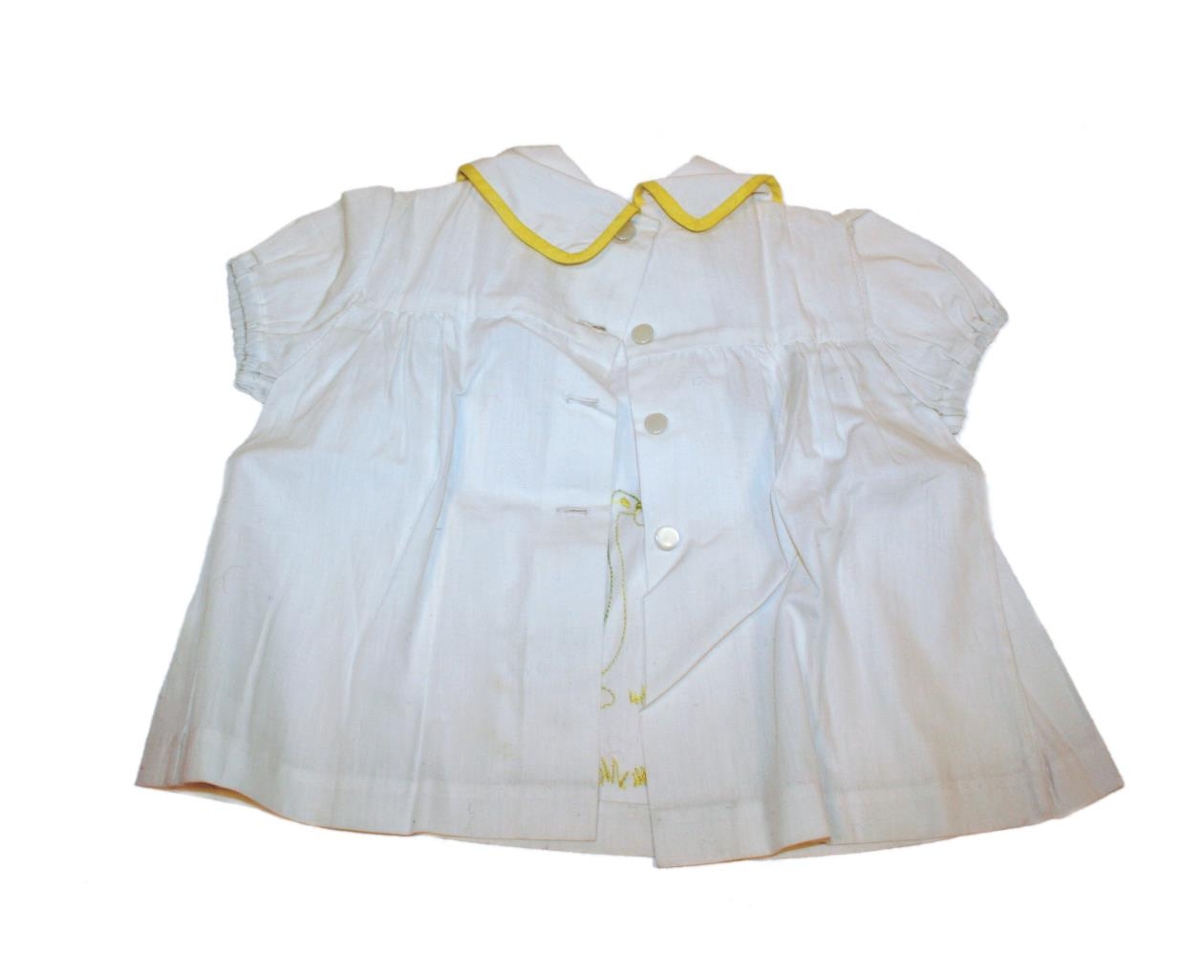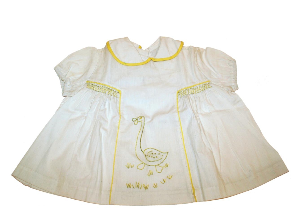 a) Telpukjóll. Vélsaumur og útsaumur. Kjóllinn er saumaður saman á hliðum og öxlum með tvöföldum saumi. Hann er í þremur stykkjum að framan, sléttur í miðju með vöfflusaumi til beggja hliða. Úsaumuð mynd að framan (gæs). Hliðarstykkin eru saumuð við með miðseymi. Lítill ávalur (rúnnaður) kragi, bryddaður með skábandi. Litlar púffermar. Lítið berustykki að aftan og kjóllinn hnepptur niður bakið. Fjögur handunnin hnappagöt. Kjóllinn er saumaður 1962-1963, samkvæmt námskrá 1960 (sjá einnig drög frá 1948).