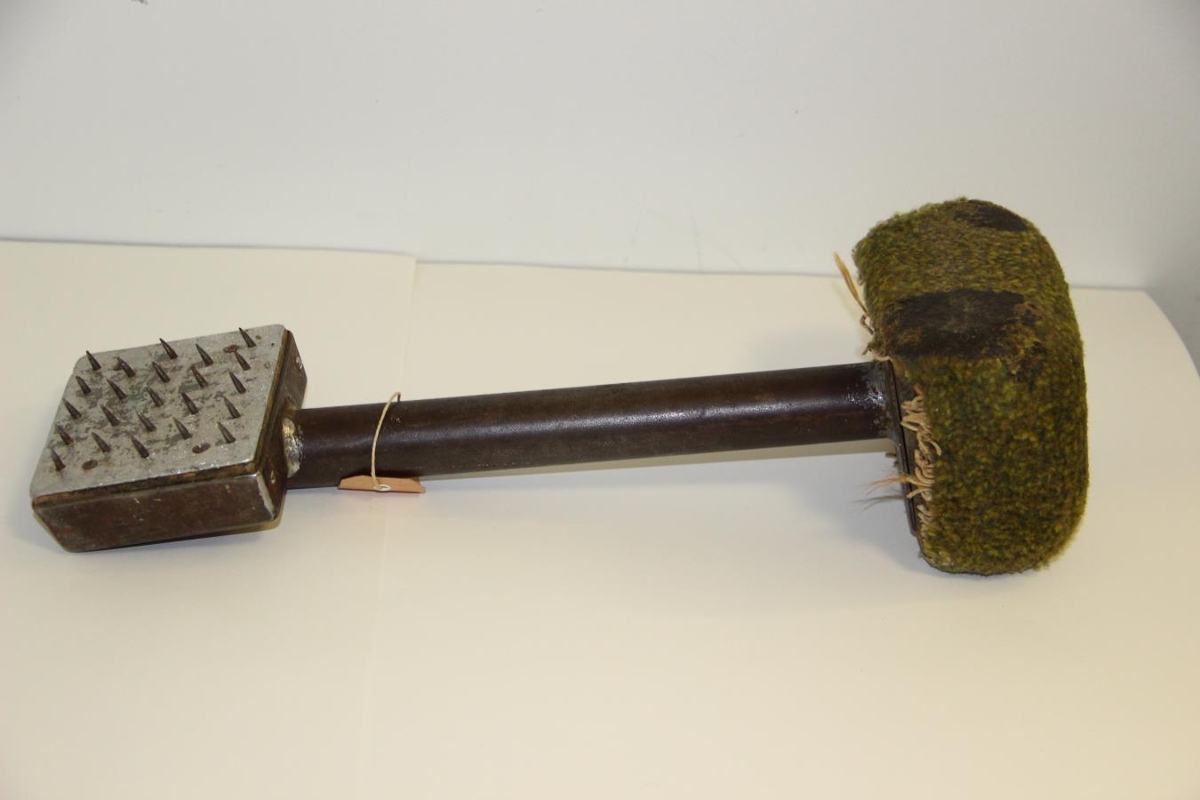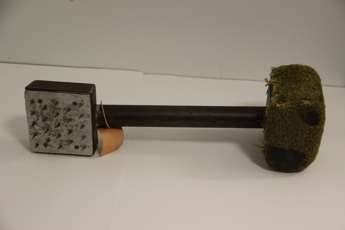 Strekkjarinn er úr málmi með gaddahaus en handfangið er klætt mosagrænu taui. Þetta er handverkfæri bólstrara.