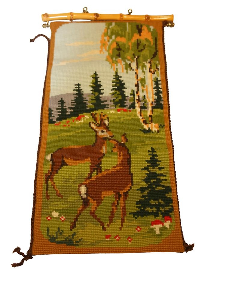 Klukkustrengur, krossaumur. Myndefni eru tvö dádýr í skógi. Saumu í kringum 1970. Kemur úr dánarbúi Sigursteini Árnasyni (1915-2011) á Sólmundarhöfða