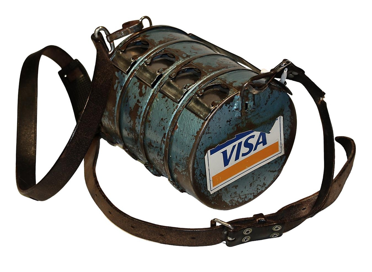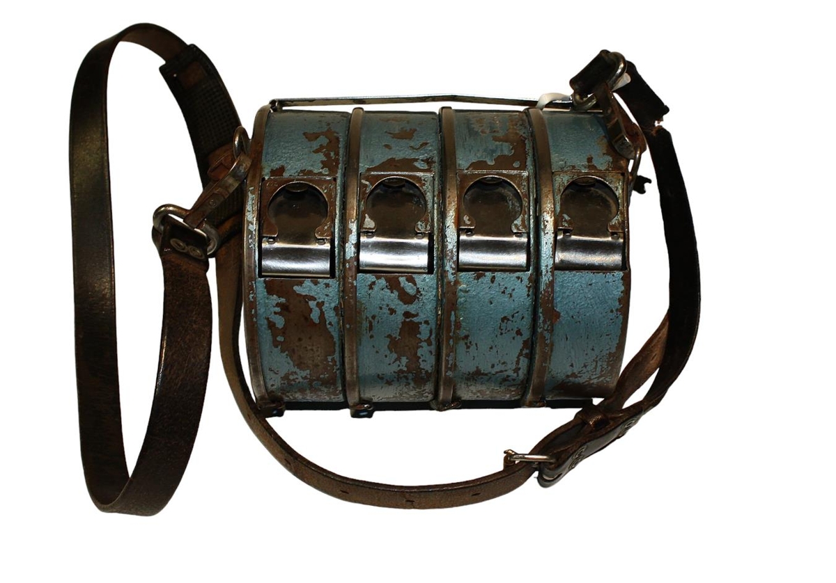 Miðasöluvél / miðakassi frá ms Akraborg. Kassinn er með fjórum miðahólfum, blá að lit og líklega notuð á árunum 1982 til 1996. Lengd 17,5 sm og þvermál 15 sm.