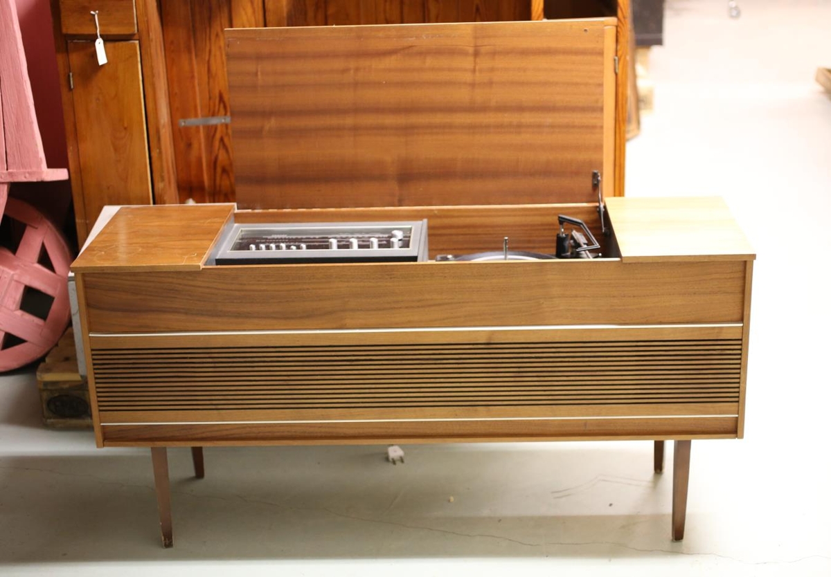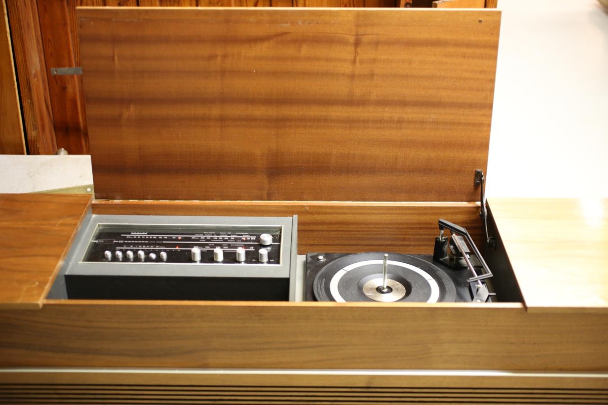 Útvarpsskápur úr tekki sem í er útvarp og plötuspilar af gerðinni Fidelity og á að fylgja tekkhillusamstæðu sem hefur sama númer. Var í eigu gefanda.