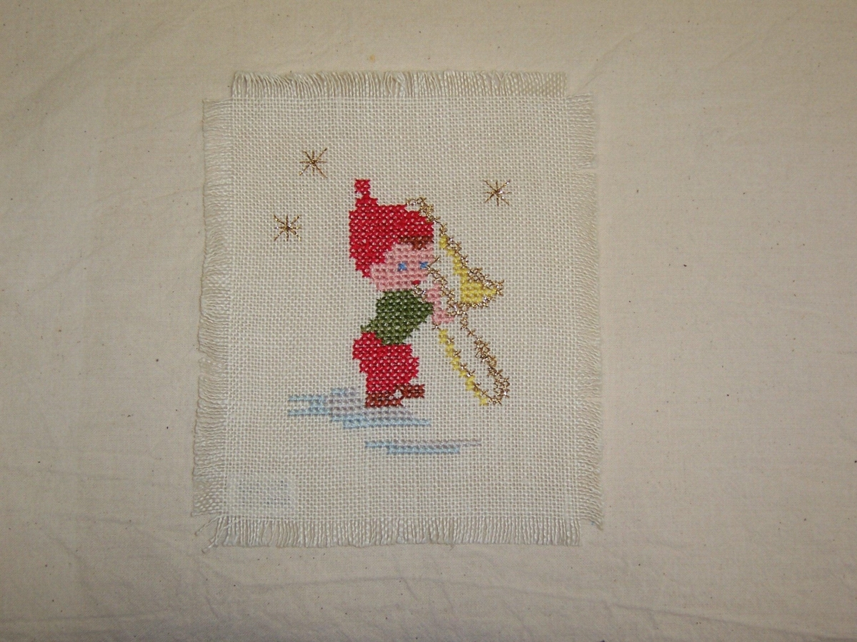Lítil jólamynd (dúkur) saumuð í ljósan hör með krosssaumi. Á myndinni er lítill jólasveinn að spila á gyllta básúnu. Þrjár gylltar stjörnur eru yfir honum.