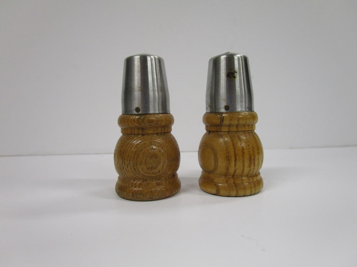 Tveir kryddstaukar (a - b) sennilega fyrir pipar og salt. Neðri hluti úr brúnum viði, efri hluti úr stáli.
